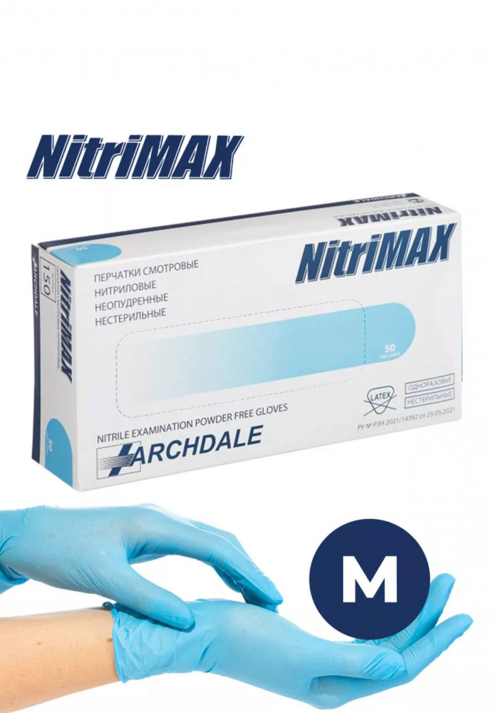 Перчатки Нитриловые ARCHDALE NITRIMAX Голубые М Малайзия (3гр)50пар/уп